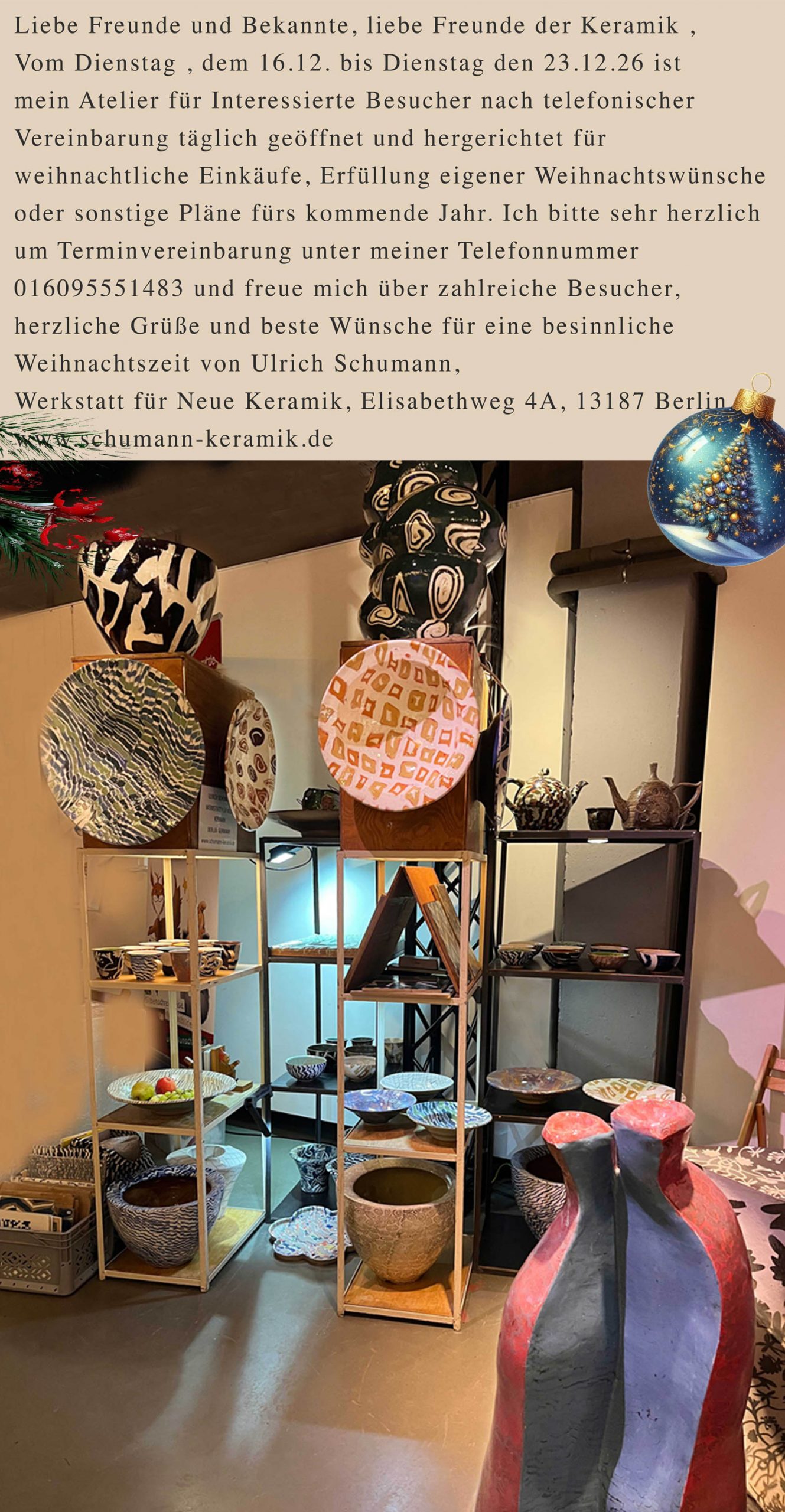In den 80er Jahren habe ich meine erste Keramikwerkstatt in Schöneiche gegründet. Ich freue mich besonders nach über 40 Jahren wieder hier auszustellen. Herzlich Willkommen!!